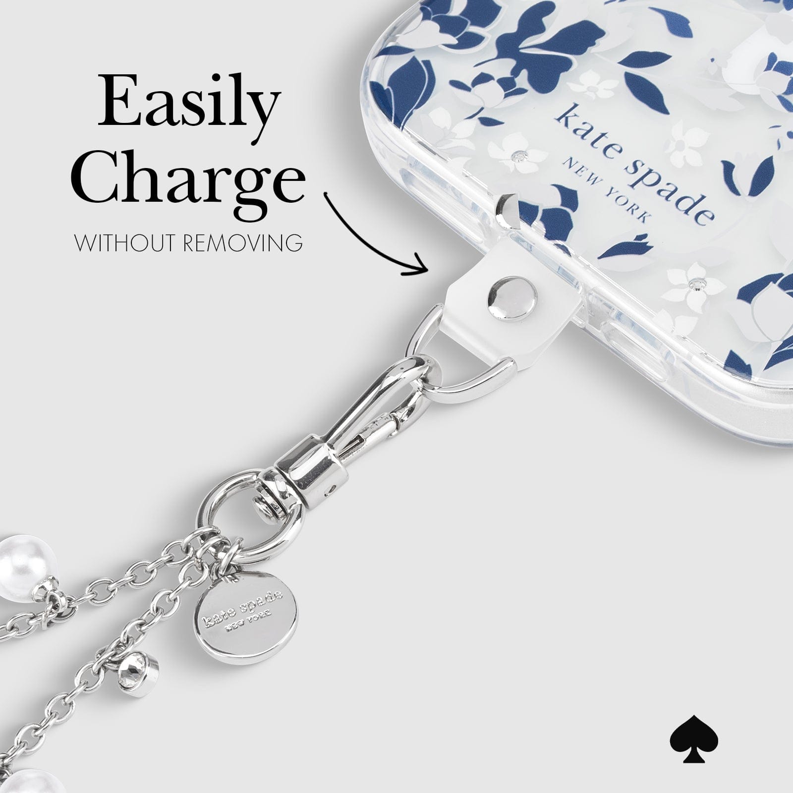 Carry your phone like a clutch and go hands-free for a night on the town or when out running errands with the Kate Spade Phone Charm! This Phone Charm is designed to fit with all phone cases and allows you to charge your phone without removing it.