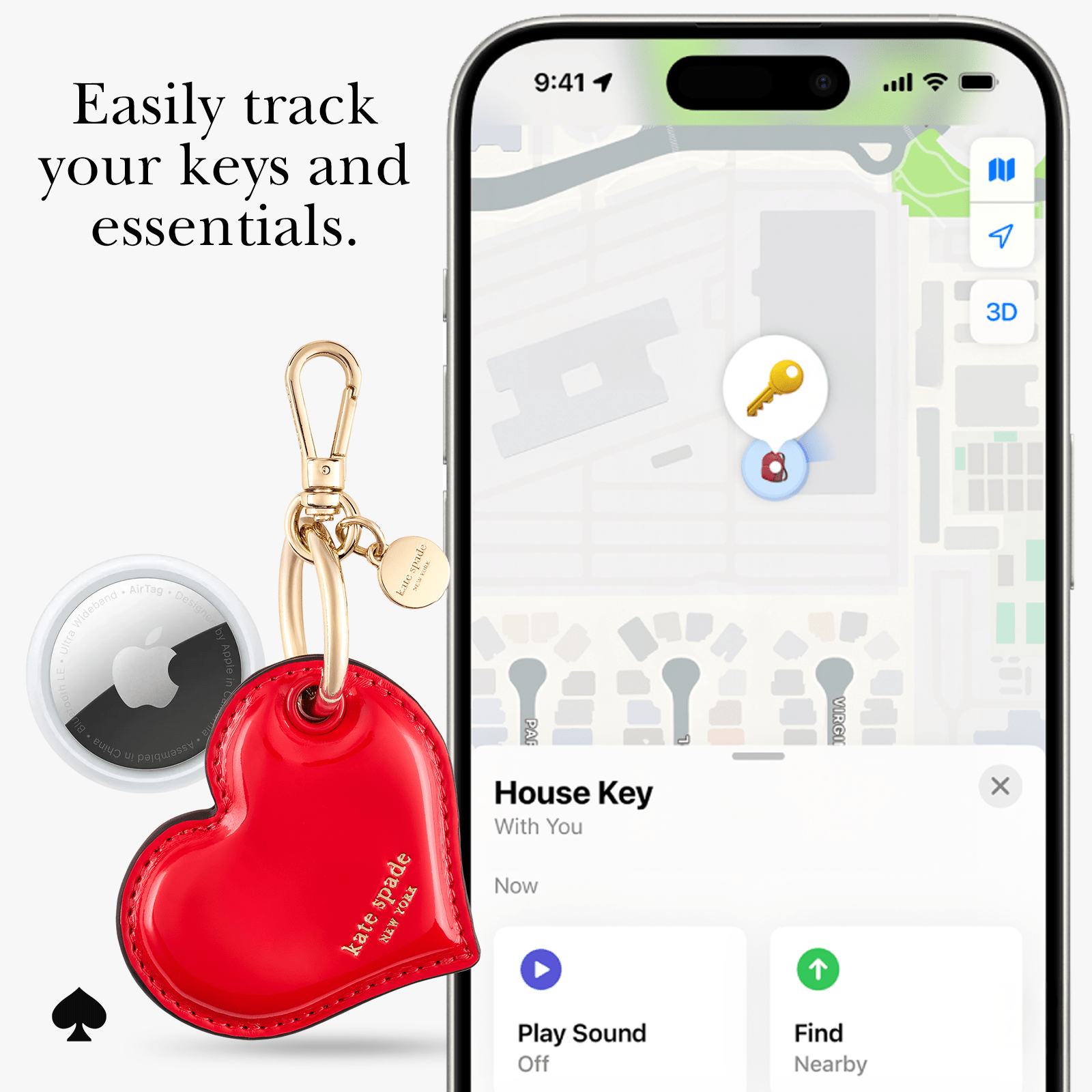 Put an end to the never-ending scramble to find your keys, wallet, or bag with kate spade new york’s colorful heart-shaped AirTag Keychain. The hidden compartment keeps your AirTag discreet, so it looks like a chic bag charm while keeping track of your essentials. Easily insert and remove your AirTag device and attach the keychain to your purse, keys, backpack, or anything else you want to keep tabs on. How easy is that?