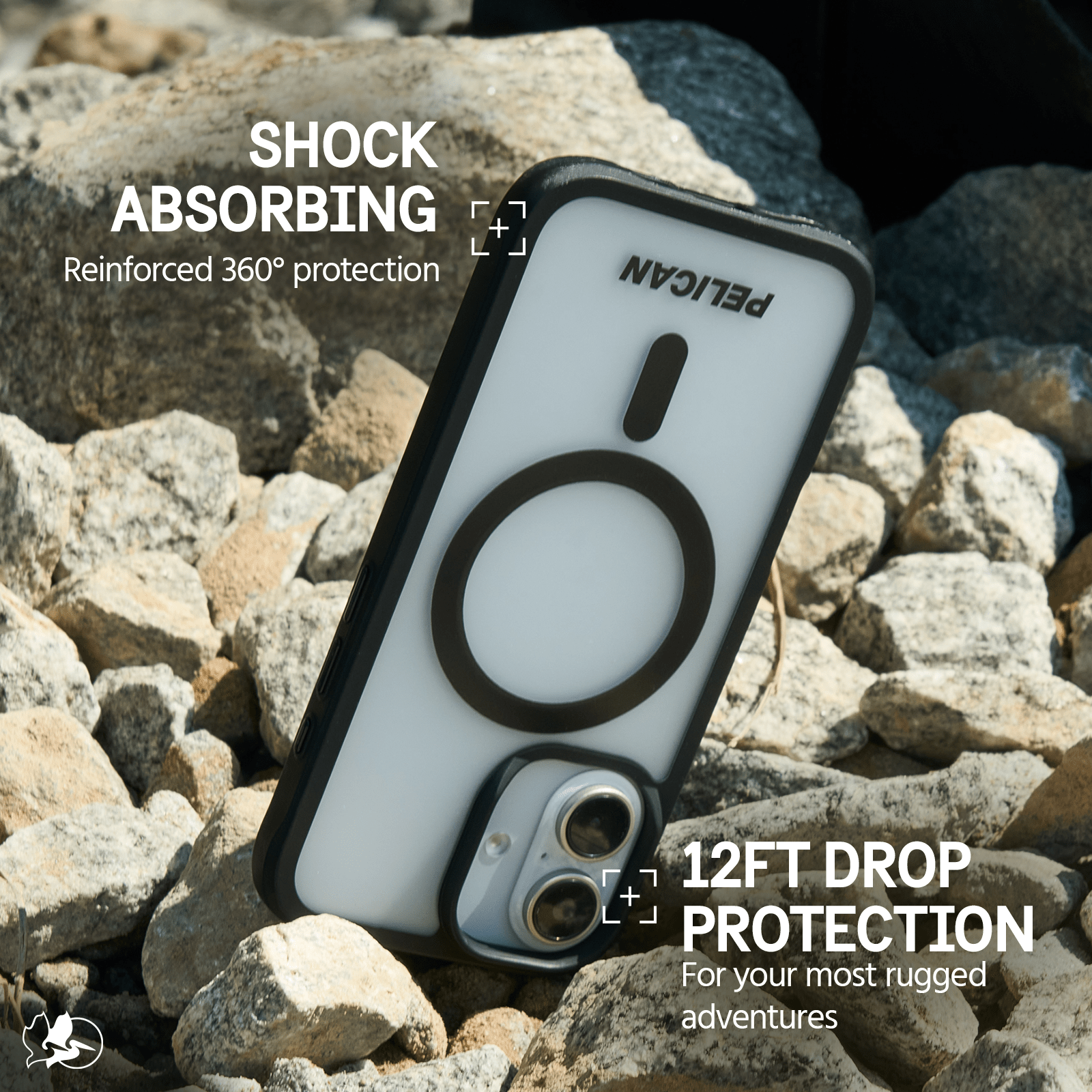 The minimalist design of this Pelican Ranger MagSafe Case gives you ultimate protection in a sleek profile. The reinforced back panel, cushioned corners, and impact-absorbing ridges provide maximum protection for your device. The brand trusted by professionals since 1976, protects your phone with 14-foot drop protection, while strong built-in magnets allow for easy MagSafe charging.