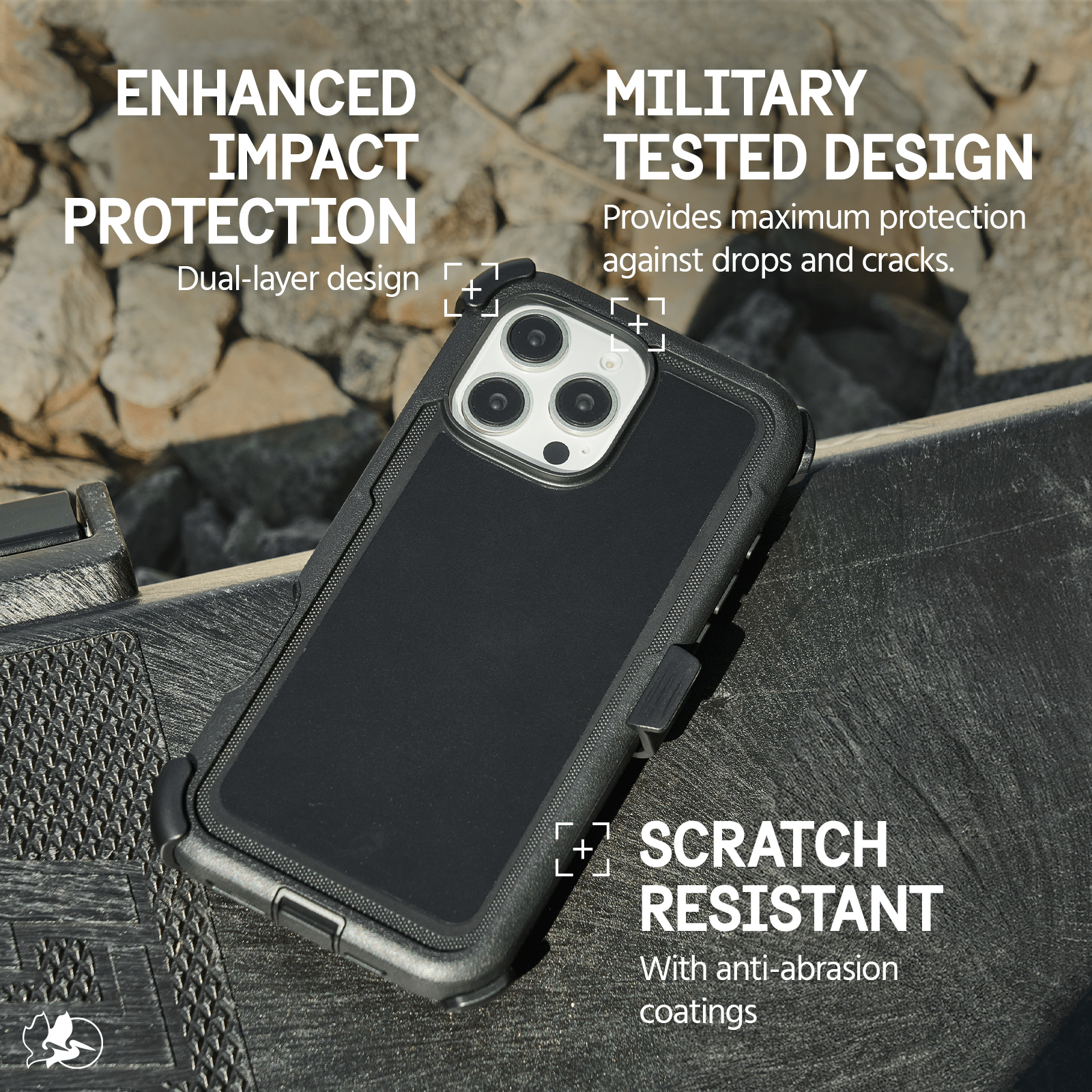 Strength, resistance, impact— The Pelican Voyager MagSafe Phone Case for the iPhone 16 Pro features dual-layer impact protection that keeps your phone safe from drops while a non-slip edge design enhances your grip. Carry your phone with the phone holster and prop up your phone with the integrated phone stand. The brand trusted by professionals since 1976, protects your phone with 18-foot drop protection, while strong built-in magnets allow for easy MagSafe charging.