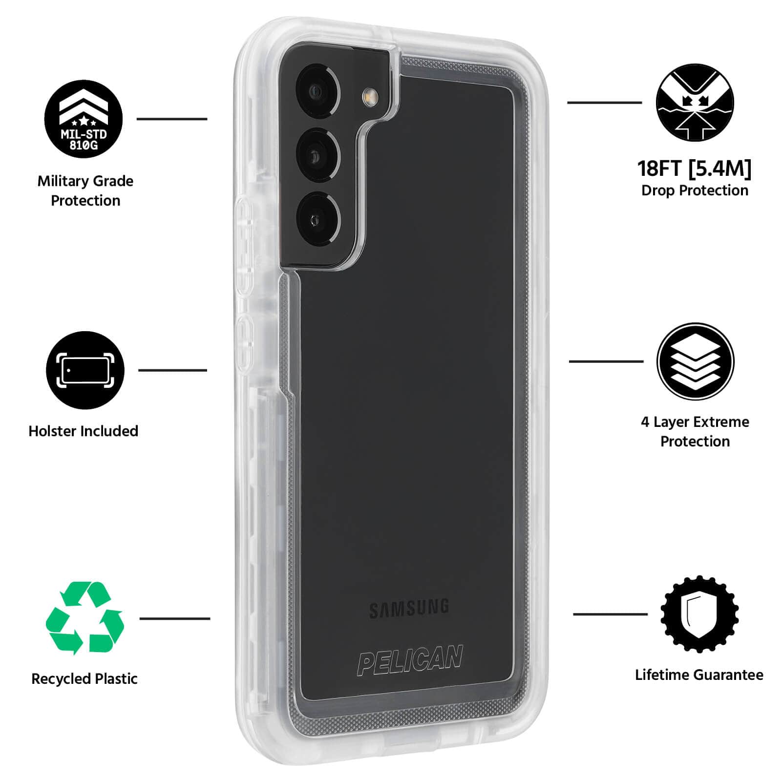 The Pelican™ Voyager case for the Galaxy S22+ protects against impact, shock, and more. Four layers of rigid polycarbonate and energy-absorbing TPR and PU rubber disperse impact energy, and we’ve tested it to military specifications to survive multiple drops.