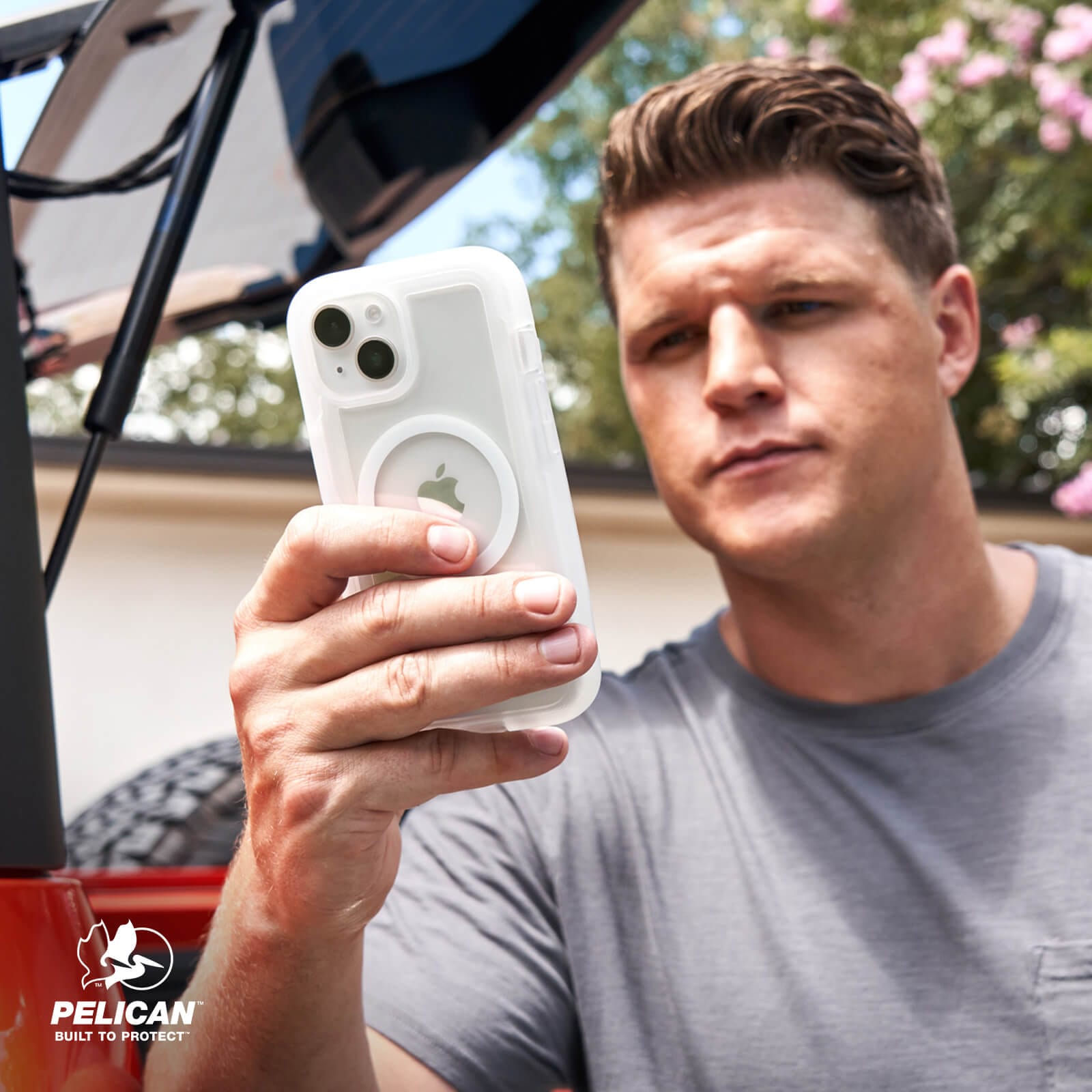 Strength, resistance, impact— The Pelican Voyager MagSafe Phone Case for the iPhone 15 Plus features dual-layer impact protection that keeps your phone safe from drops while a non-slip edge design enhances your grip. Feel confident knowing your phone is secure with 18-foot drop protection, while strong built-in magnets allow for easy MagSafe charging.