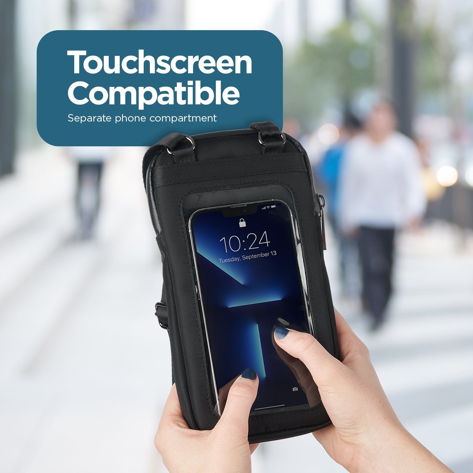 The ultimate mobile crossbody to carry your phone and essentials! Conveniently tote your phone, keys, cash and other essentials in this compact, trendy bag. The shoulder strap adjusts to your desired length, so you can wear it however you like! The Phone Crossbody features a separate phone compartment constructed of mobile friendly clear material allowing you to keep using your phone without having to remove it.