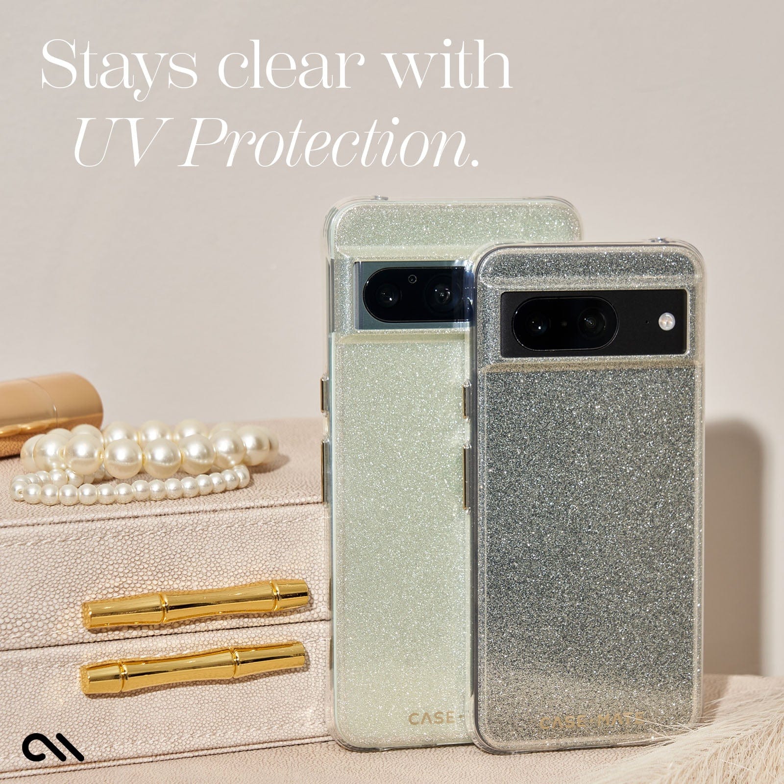 Minimalistic and elegant— let your phone shine with the Sheer Crystal Gold Phone Case for the Google Pixel 8! The gold crystal sparkles in this case catch the light for a perfect shimmering effect. We know how much you love your phone, so feel confident it’s safe with 12-foot drop protection.