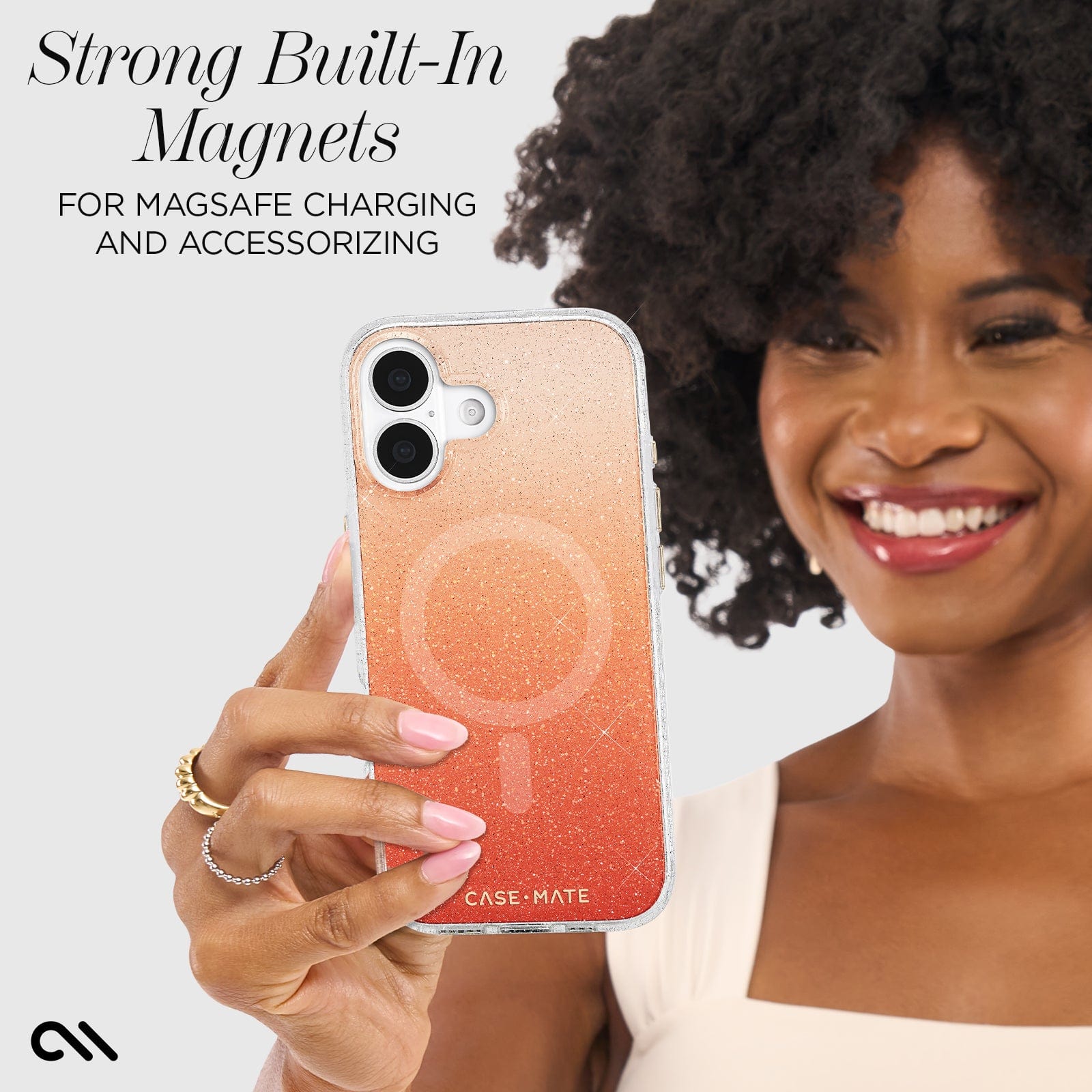 Let your phone shine with the Sheer Twinkle Orange Ombre MagSafe Phone Case for the iPhone 17! The sparkling orange ombre design catches the light for a perfect shimmering effect, while strong built-in magnets allow for easy MagSafe accessorizing and charging. We know how much you love your phone, so feel confident knowing it’s safe with 12-foot drop protection.